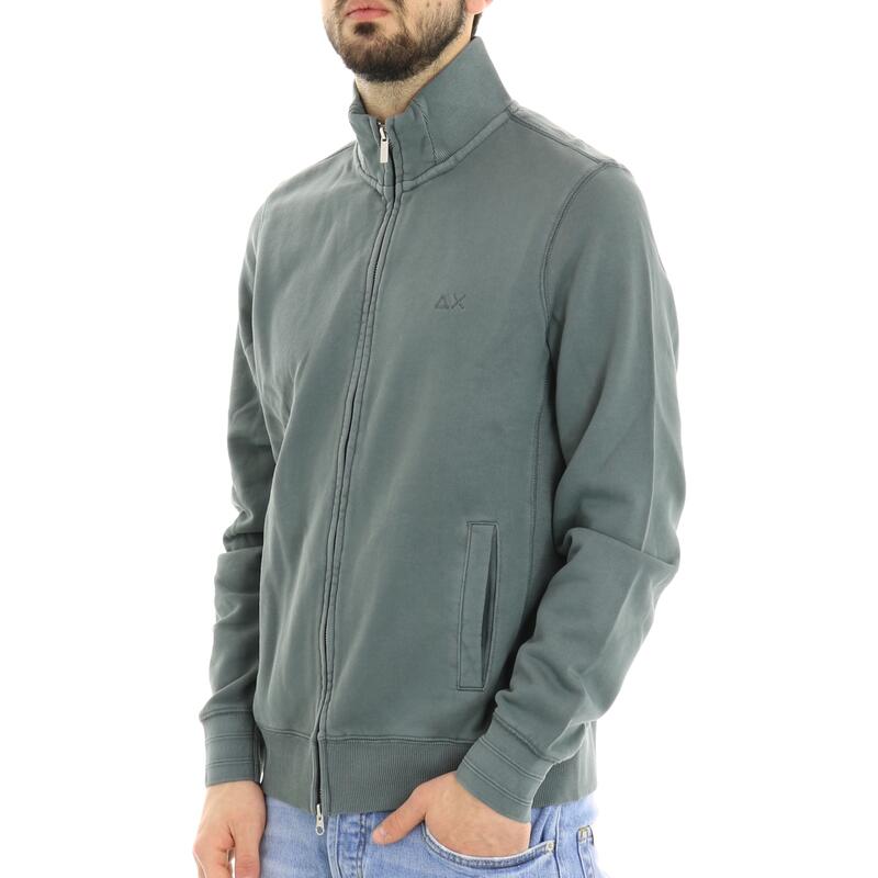 Felpa aperta con zip doppio cursore, collo in piedi, tintura a freddo, logo ricamato frontale, tasche. Vestibilità regular.
