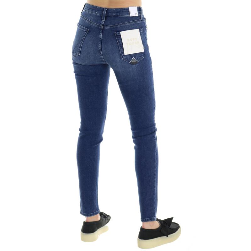 Jeans stretch leggermente slavato, vita alta, chiusura con bottone e zip, logo patch sulla tasca. Vestibilità skinny.