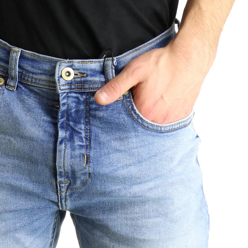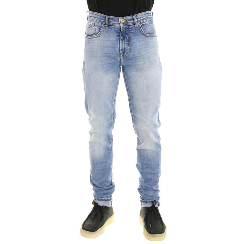 Jeans stretch, slavato, cuciture e salpa a contrasto, vita media, chiusura con bottone e zip. Vestibilità slim.