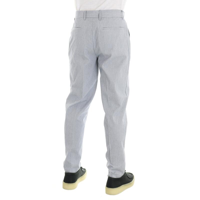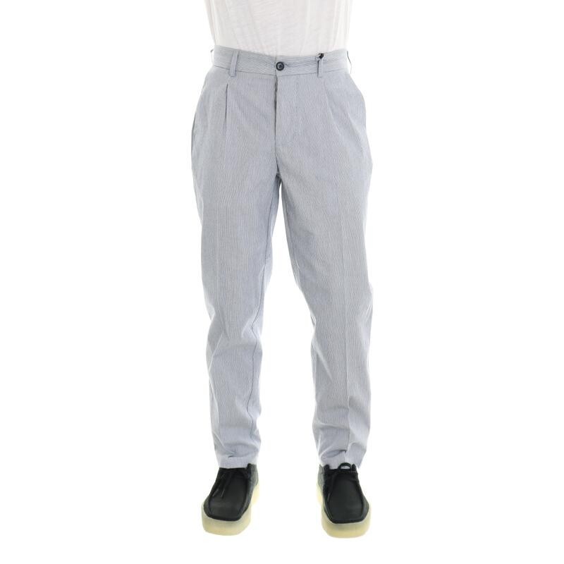 Pantalone in fantasia millerighe, vita media, cavallo calato, pinces, tasca america. Vestibilità regular.