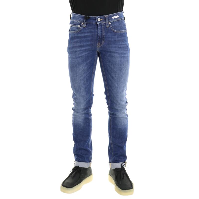 Jeans stretch, lavaggio medio, vita media, salpa a contrasto, chiusura con bottone e zip. Vestibilità slim.