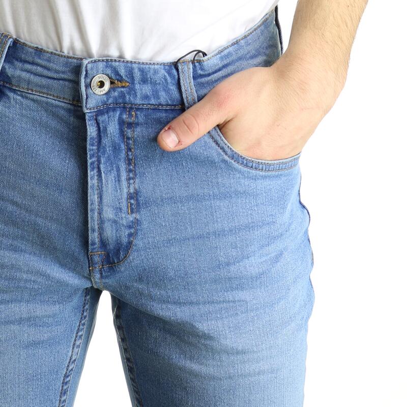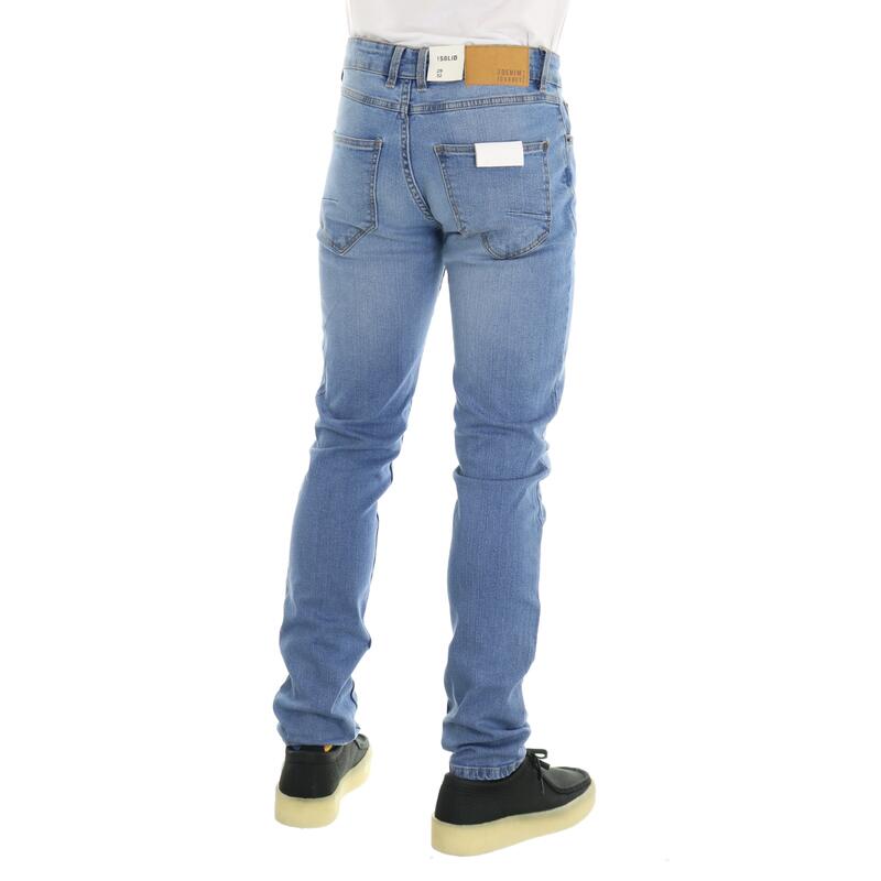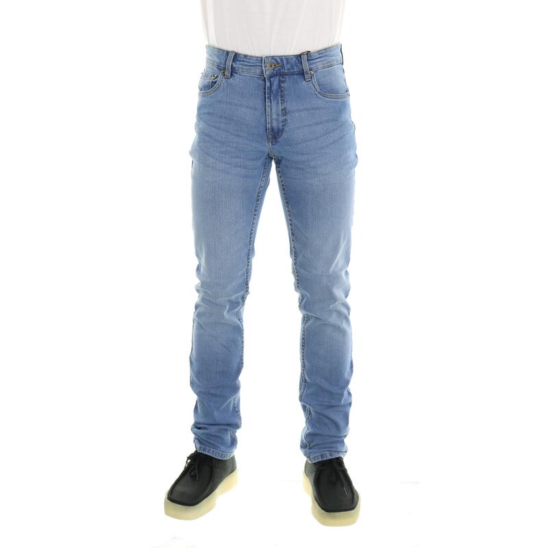 Jeans stretch slavato, vita media, salpa a contrasto, chiusura con bottone e zip. Vestibilità slim.
