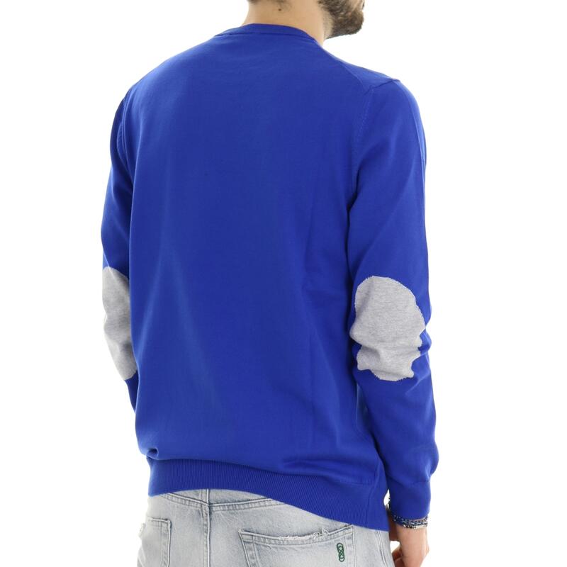 Maglia girocollo, tinta unita, toppe a contrasto sui gomiti, polsini e balza in fondo. Vestibilità slim.