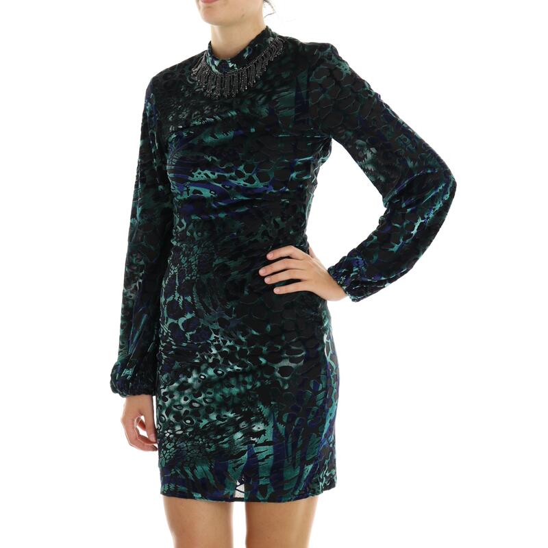 Vestito a maniche lunghe in velluto stampato, applicazioni gioiello sul collo, schiena scoperta. Vestibilità slim.