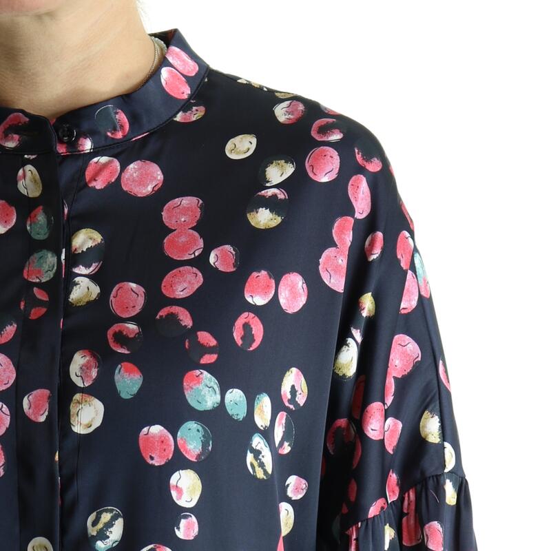 Vestito a maniche lunghe aperto davanti con bottoni fino a metà, collo alla coreana, gonna a balze, in fantasia multicolor. Vestibilità regular.