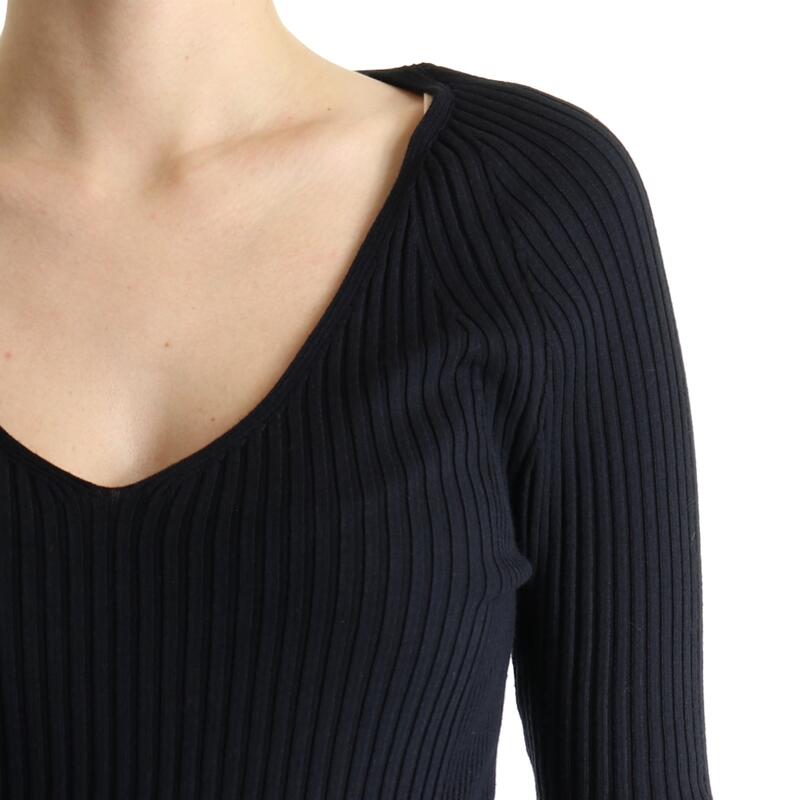 Abito manica lunga, modello midi cannetè con cintura tono su tono in vita, scollo a V e spacco laterale. Vestibilità slim