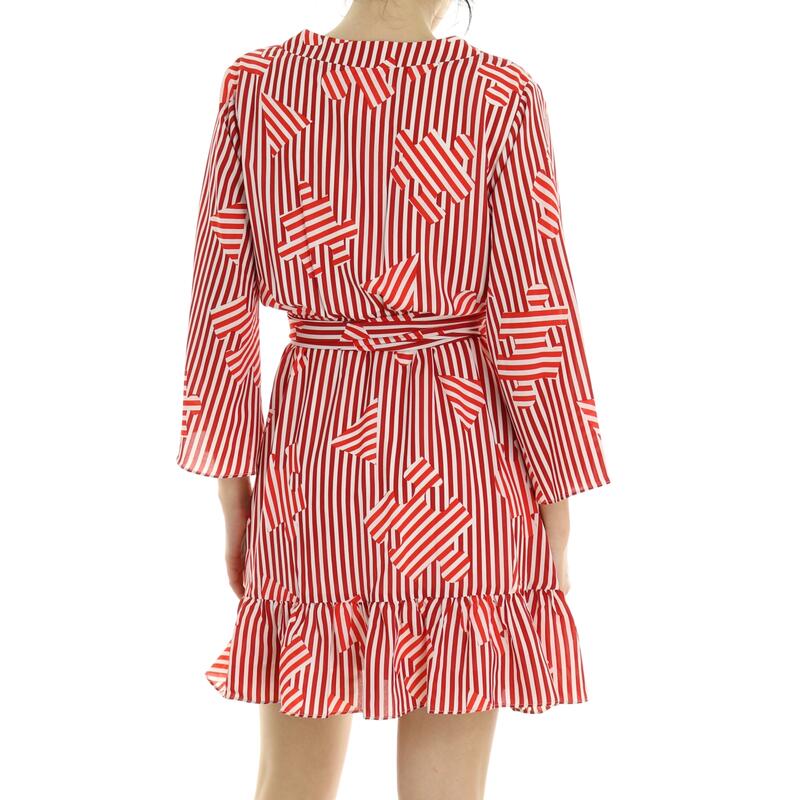 Vestito in fantasia, manica 3/4, scollo a V con incrocio, balza in fondo, fusciacca in vita tono su tono. Vestibilità regular.