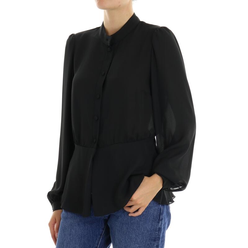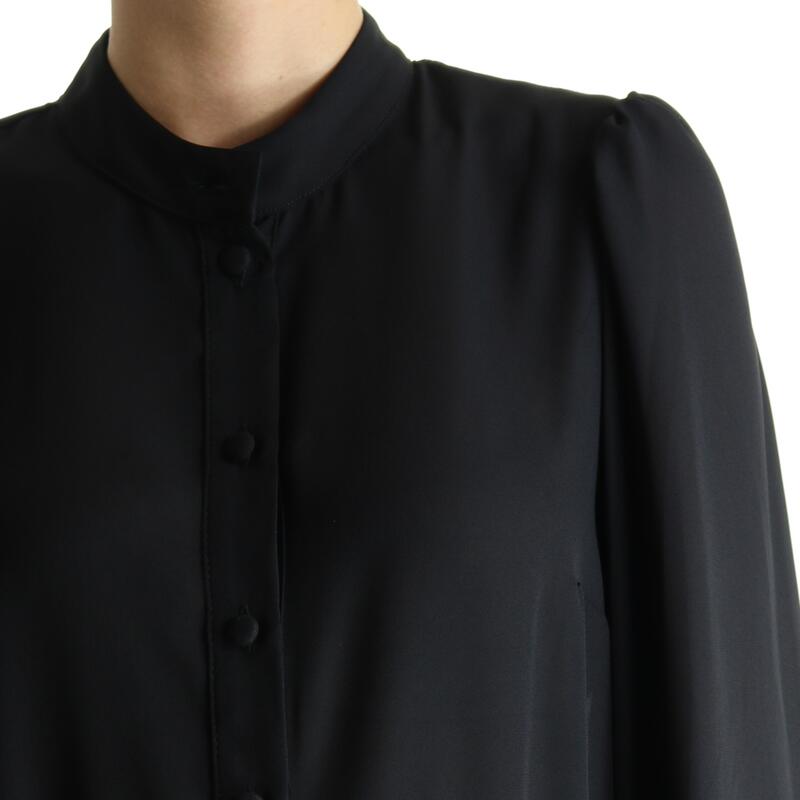 Camicia a maniche lunghe, bottoni foderati, collo alla coreana, manica ampia a buffo. Vestibilità regular.