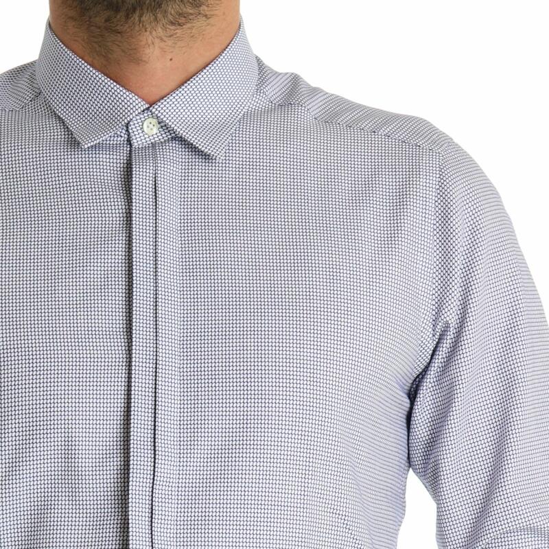 Camicia stretch, in microfantasia, collo inglese, bottoni frontali coperti, pinces. Vestibilità slim.