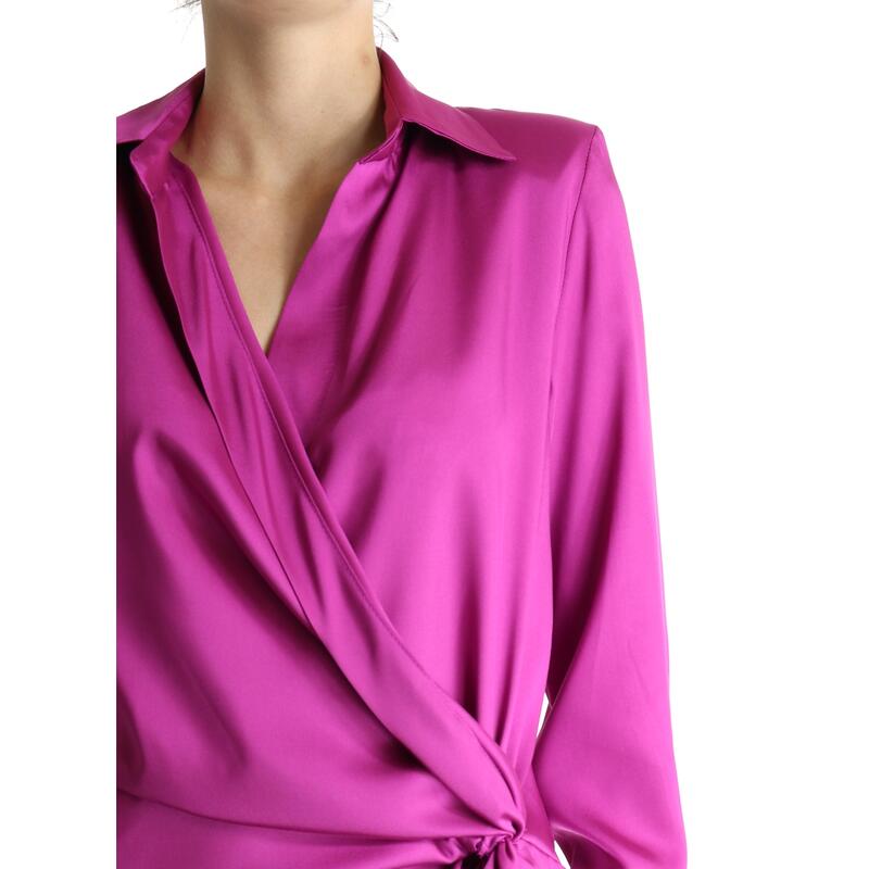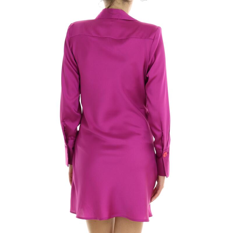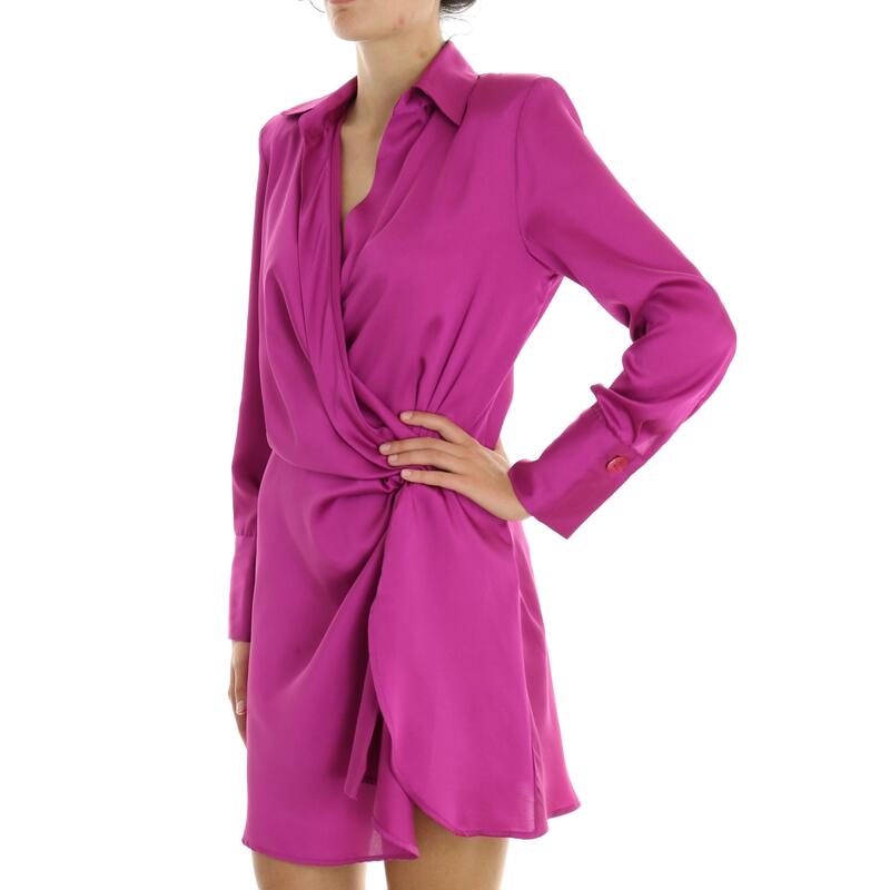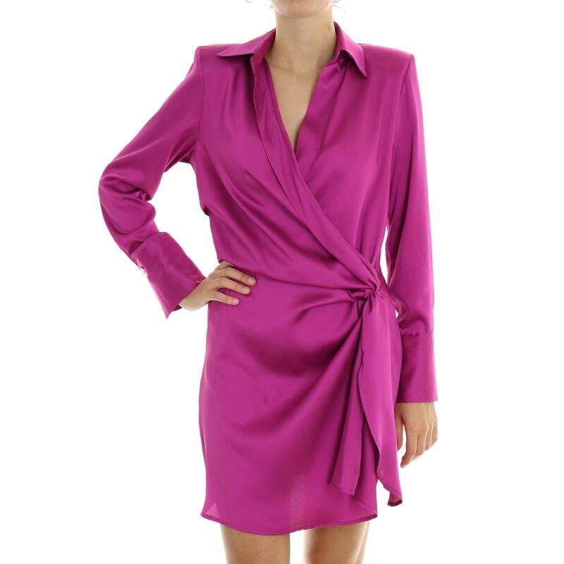 Vestito a maniche lunghe, tinta unita in raso, collo camicia, scollo a V incrociato, ripreso in vita con nodo. Vestibilità regular.