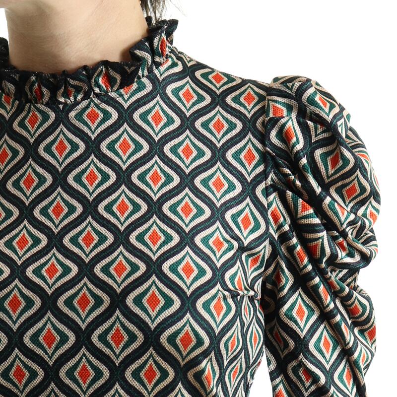 T-shirt velvet a maniche lunghe, collo in piedi con rouches, maniche a sbuffo, in fantasia geometrica. Vestibilità slim.