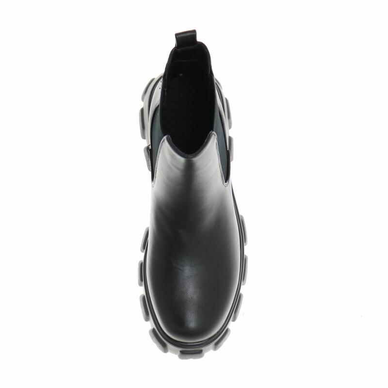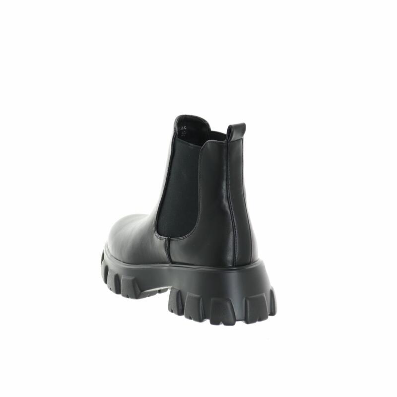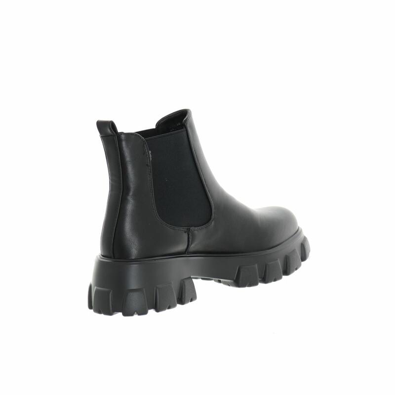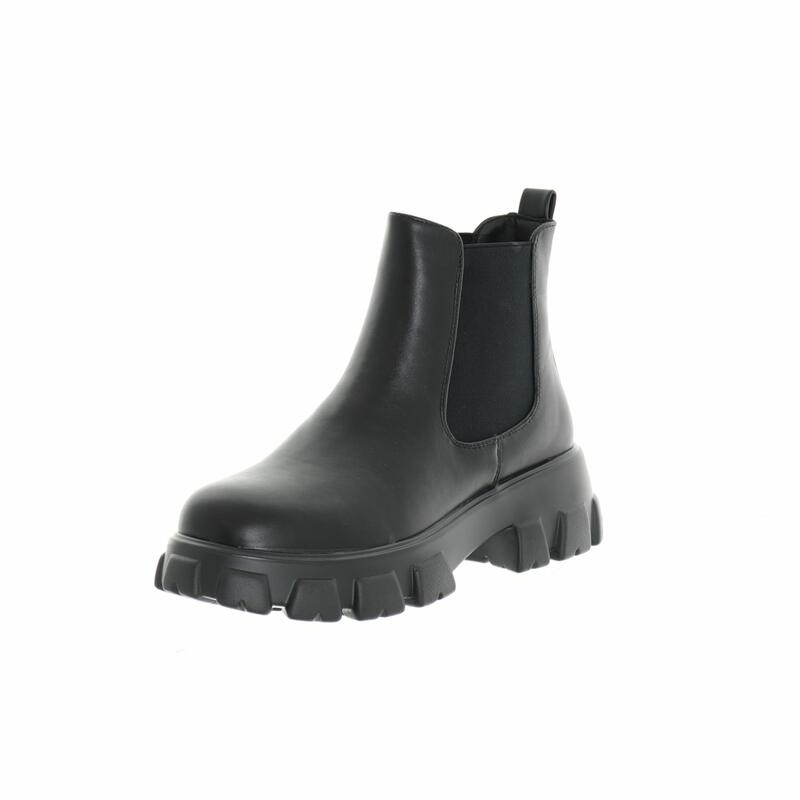 Stivaletto ecopelle, maxi suola in gomma carroarmato, inserti elastici laterali, modello pull-on con linguetta posteriore, calzata abbondante.