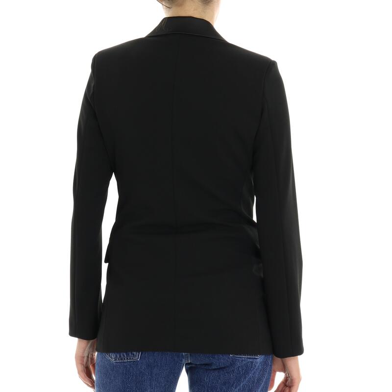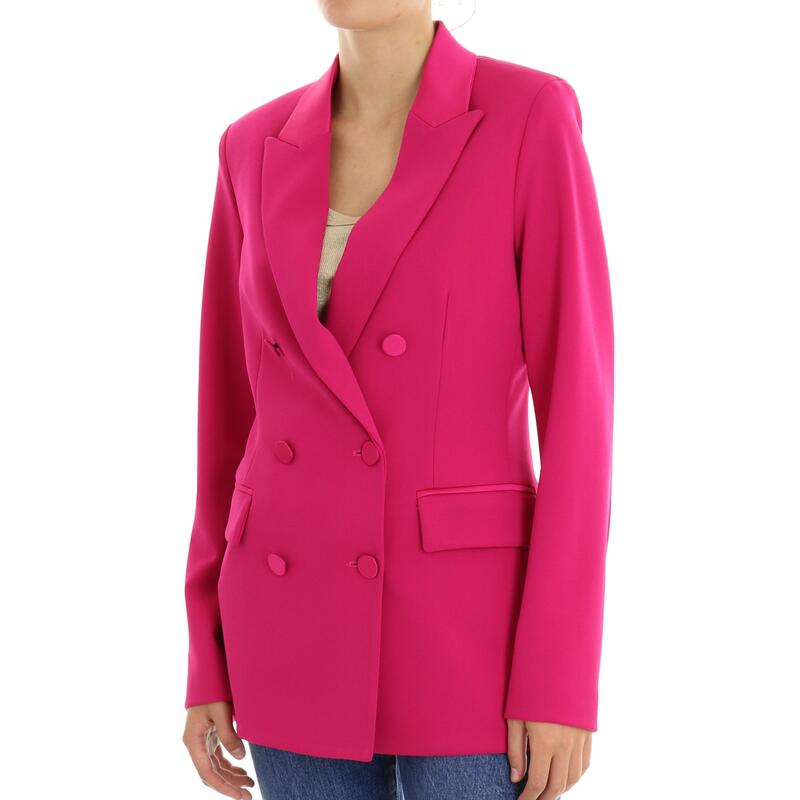 Blazer con profili su revers in raso, tasche frontali con venatura in raso, chiusura a doppiopetto con bottoni in raso. Vestibilità slim.