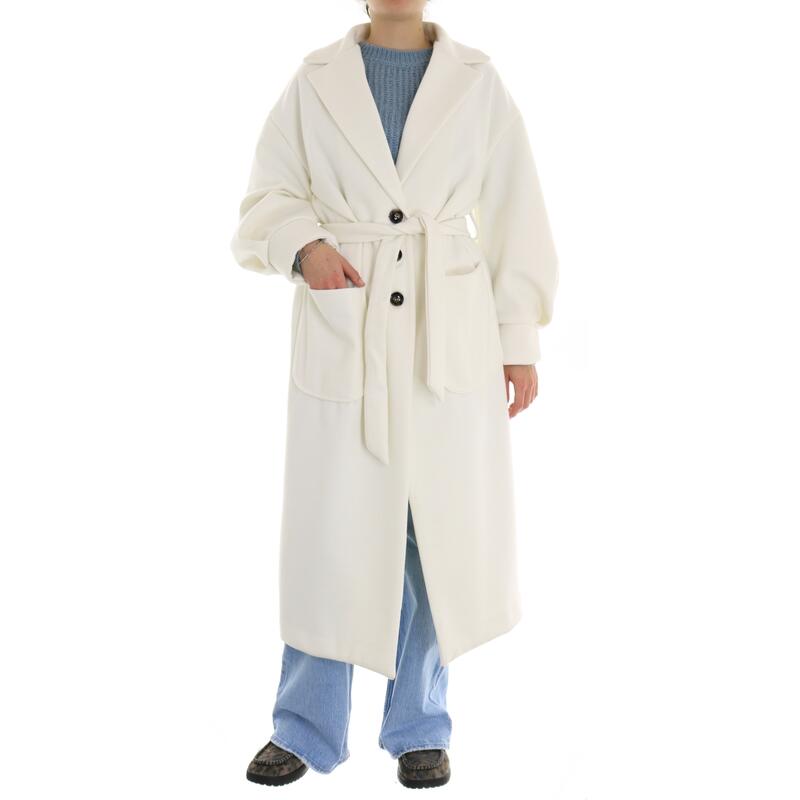 Cappotto lungo con manica a palloncino, rever largo, chiusura a tre bottoni con cintura tono su tono, tasche a toppa. Vestibilità regular.