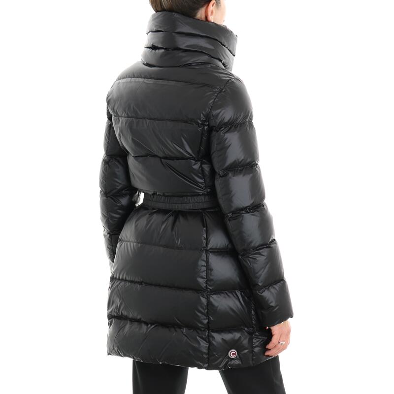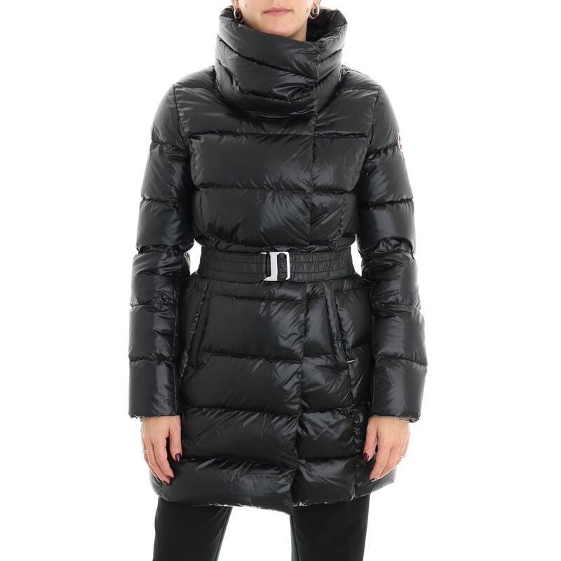Giubbotto imbottito con piuma d'oca, collo in piedi, chiusura con zip a doppio cursore coperta e bottoni automatici, cintura elastica in vita, logo cucito sulla manica. Vestibilità regular.
