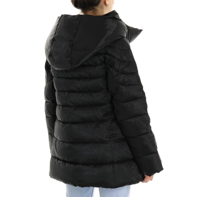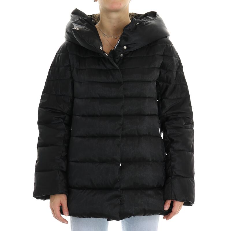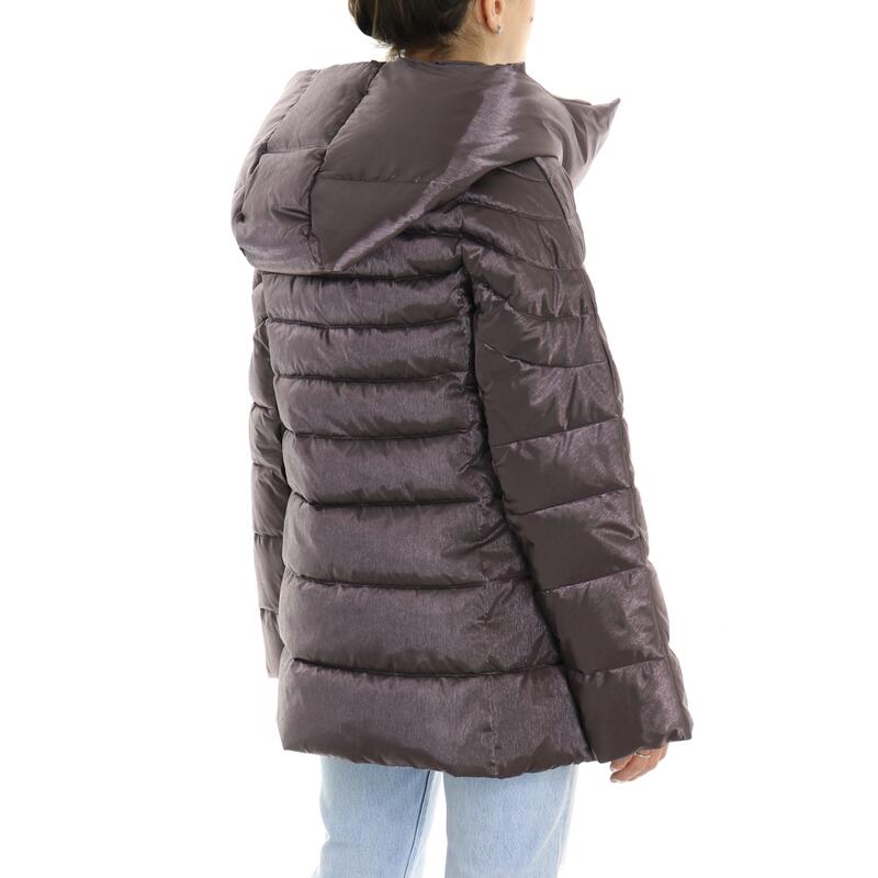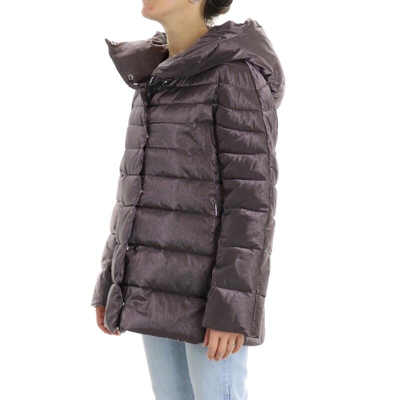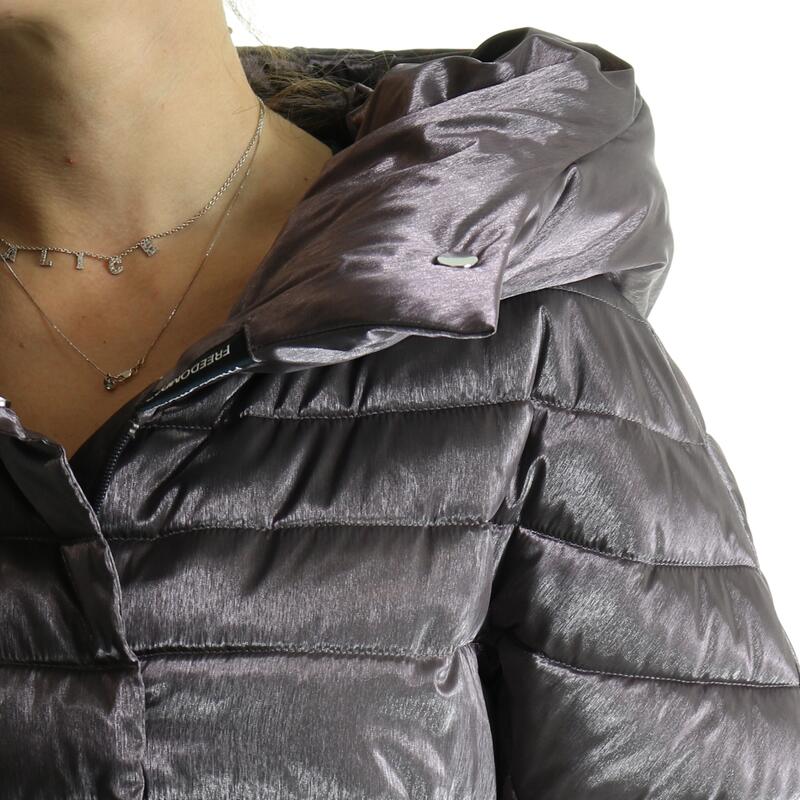 Giubbotto imbottito in piuma d'oca, effetto laminato, con cappuccio fisso, chiusura con zip doppio cursore, tasche con zip. Vestibilità regular.