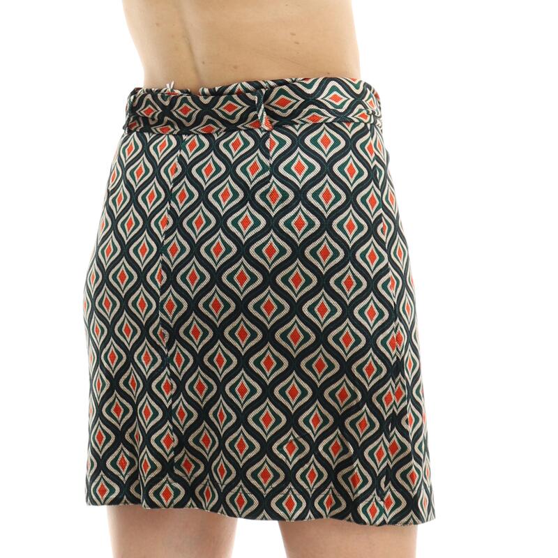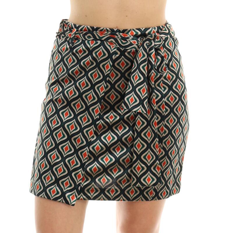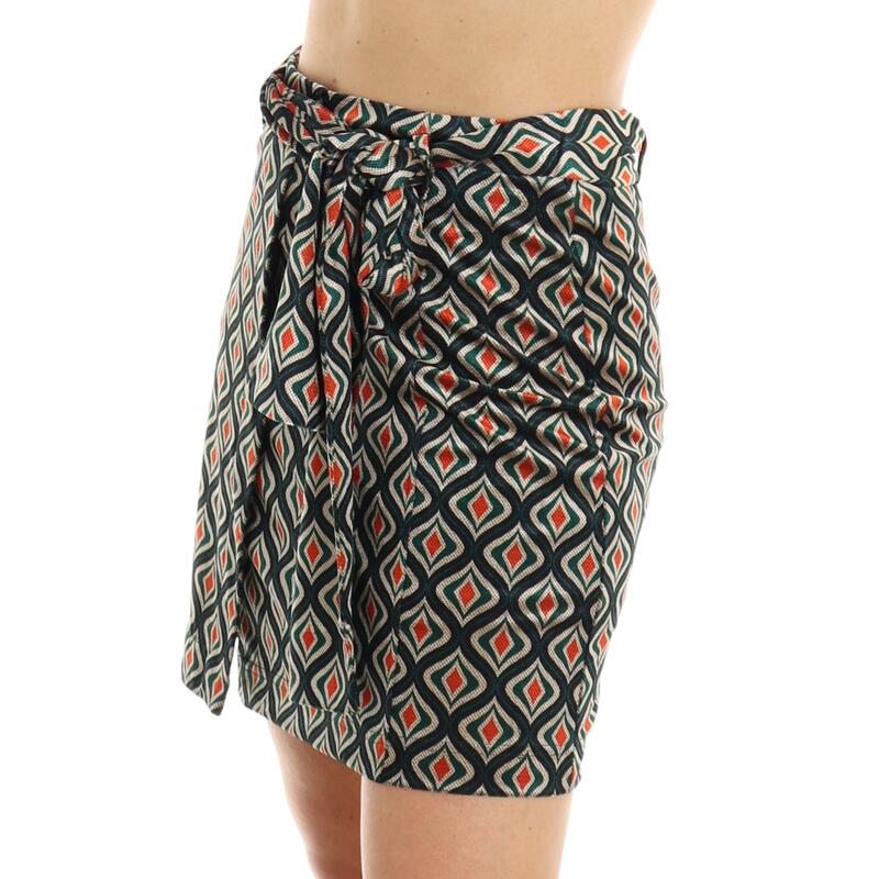 Gonna corta a portafoglio con fiocco in vita, fantasia damascata. Vestibilità regular.