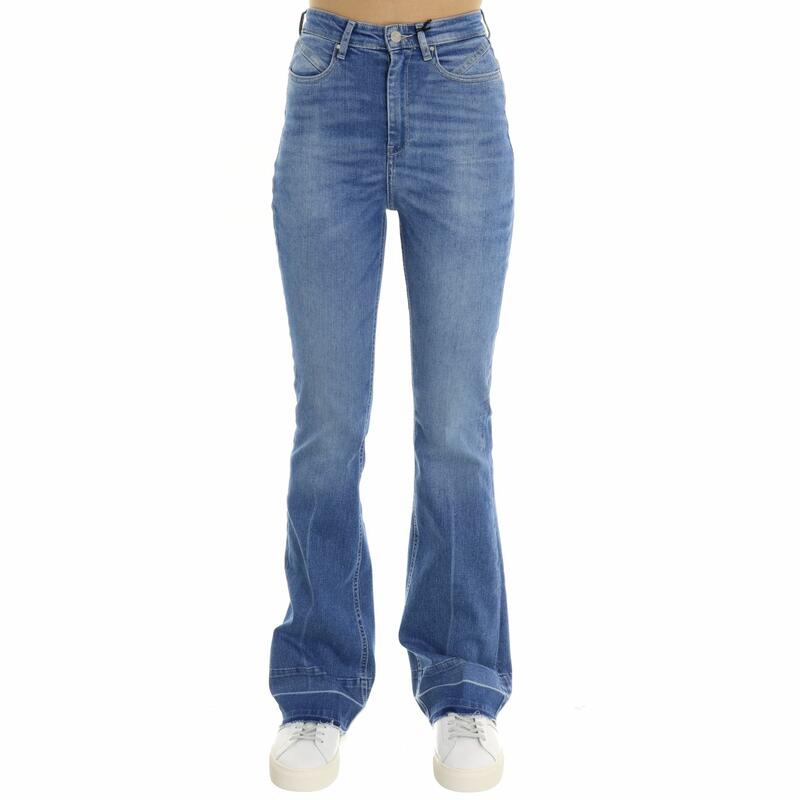 Jeans slavato vita alta, scampanato, chiusura con zip e bottone, logo guess ricamato tasca, vestibilita regular.