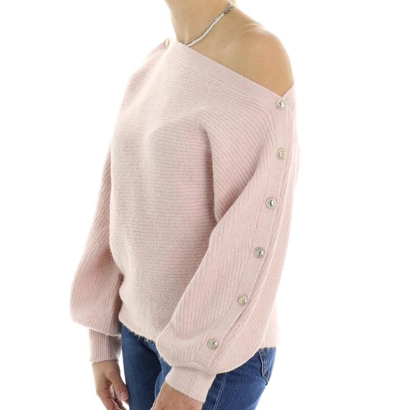 Maglia con scollo a barca, manica ampia con polsino e bottoni metal, lavorazione ottoman. Vestibilità regular.