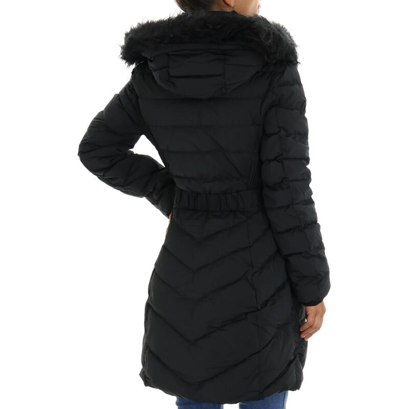 Giubbotto imbottito in vera piuma, resistente all'acqua, antivento. Cappuccio staccabile con ecopelliccia, zip frontale doppio cursore e cintura elastica in vita. Vestibilità regular.