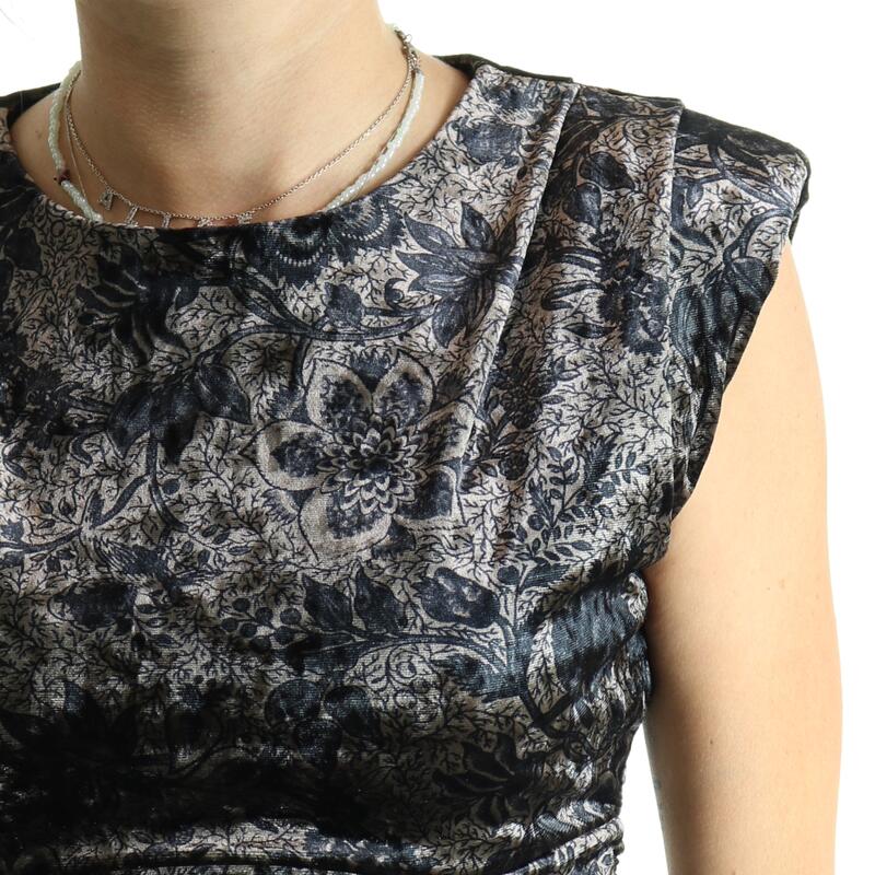 Abito velvet a tubino, fantasia bicolore, spalline imbottite, drappeggio laterale. Vestibilità slim.