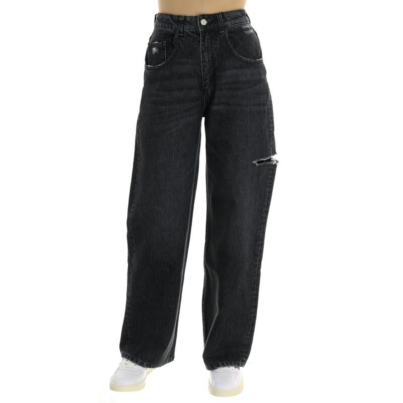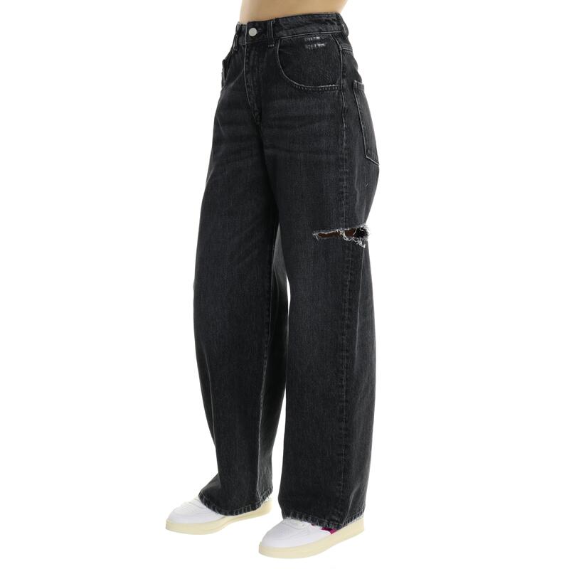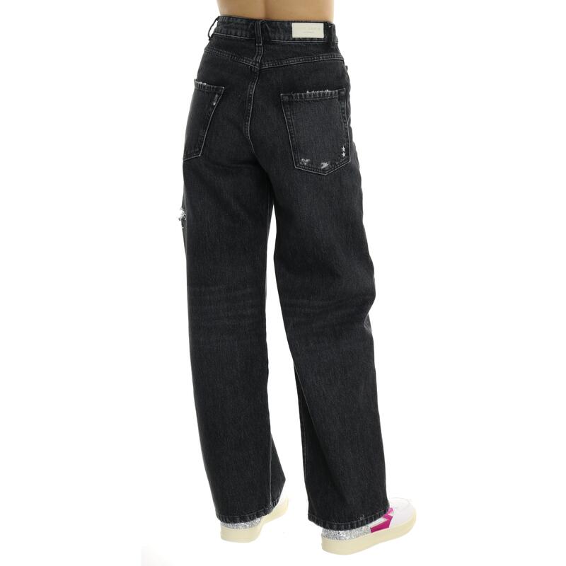 Jeans morbido a vita alta, rottura laterale, lavaggio black. Vestibilità over, si consiglia almeno mezza taglia sotto rispetto a quella solita.