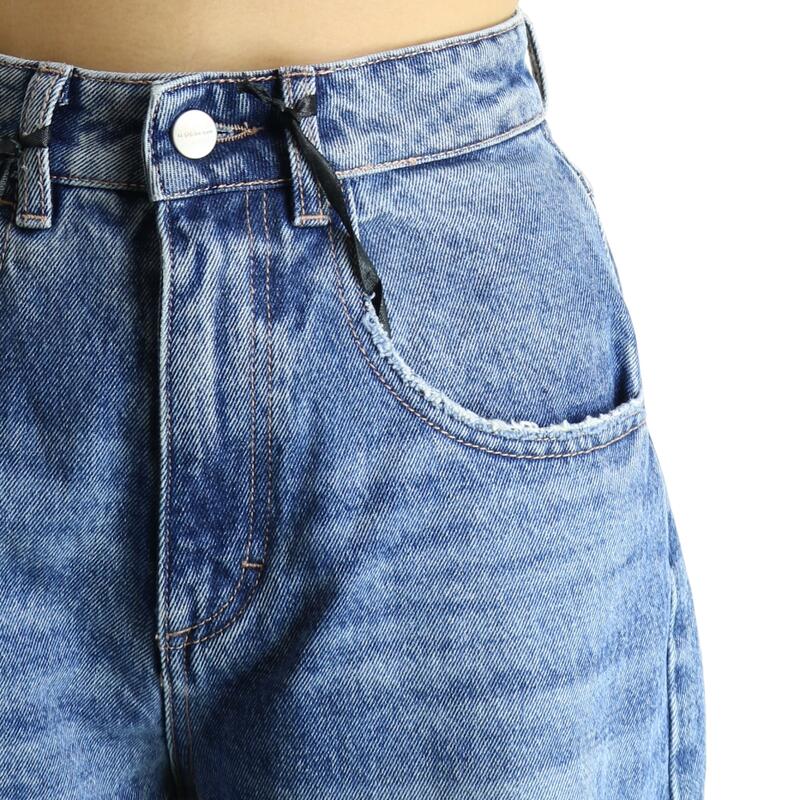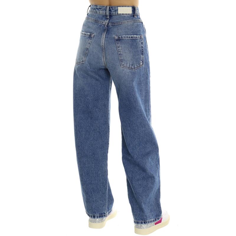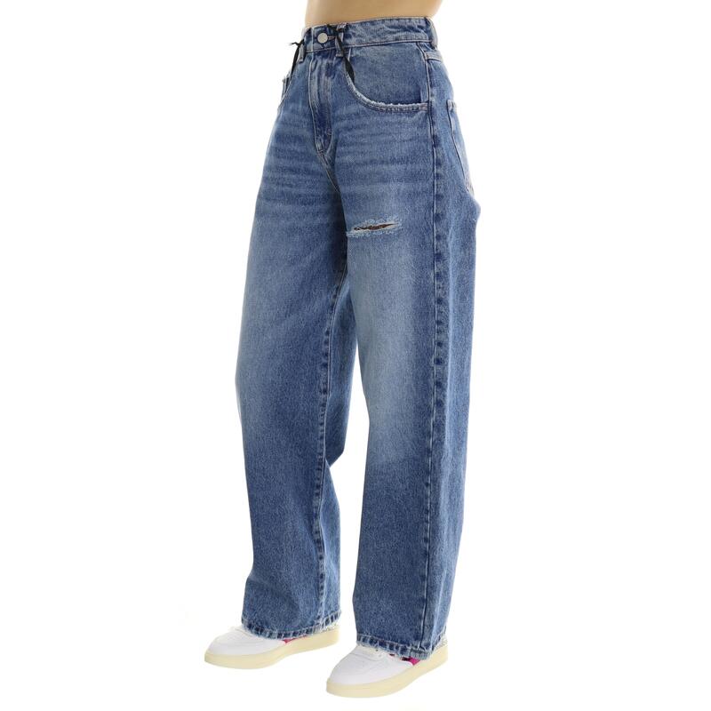 Jeans morbido a vita alta, rotturs laterale, lavaggio medio. Vestibilità over, si consiglia almeno mezza taglia sotto rispetto a quella solita.