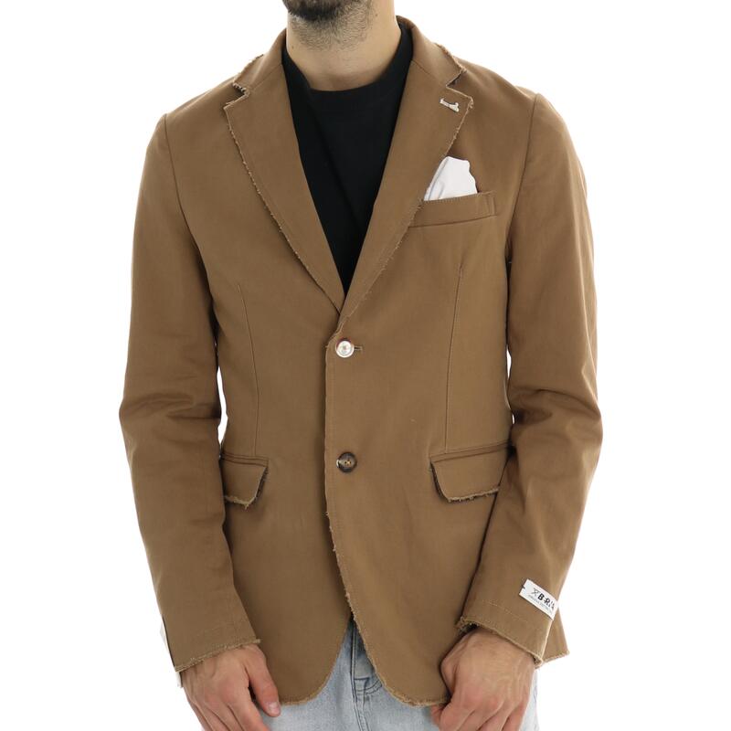 Giacca in tessuto stretch, rever classico, due bottoni, finiture taglio vivo. Vestibilità slim.
