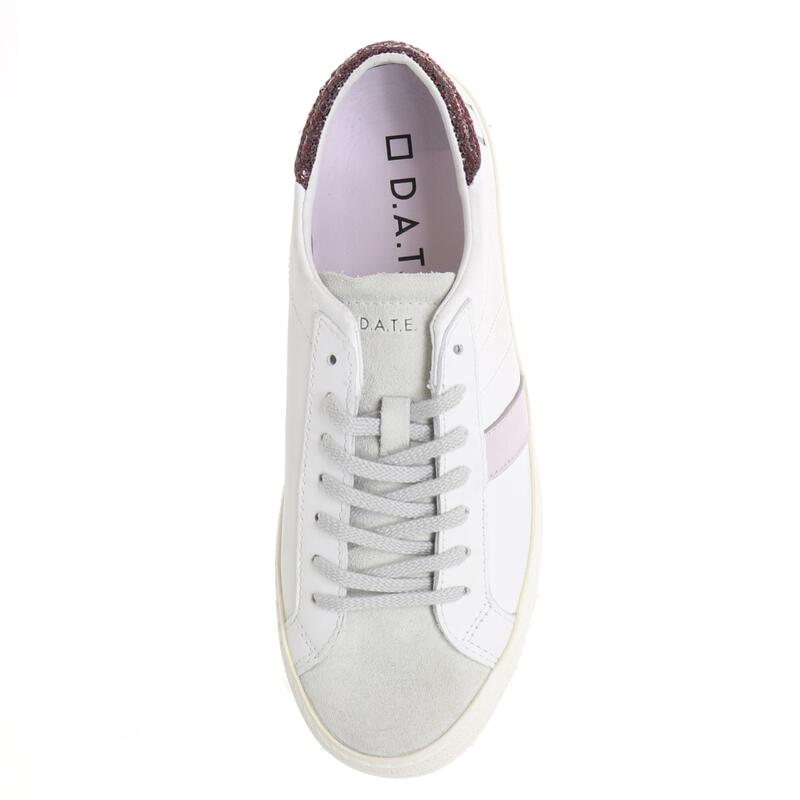 Sneaker bassa in pelle colore bianco effetto used. La punta e la linguetta, su cui è impressa la scritta D.A.T.E., sono in suede colore off white. I lacci sono in cotone e il logo quadrato e il codice sono impressi lateralmente. La banda laterale è in pelle. Il talloncino posteriore è in glitter. Fodera in pelle e spugna di cotone. Il soletto interno è rialzato di 2.5 cm per un miglior comfort. La suola in gomma con texture cemento, alta 2.5 cm, è cucita e leggermente sporcata per donare un effetto used. Calzata abbondante.