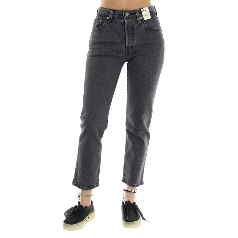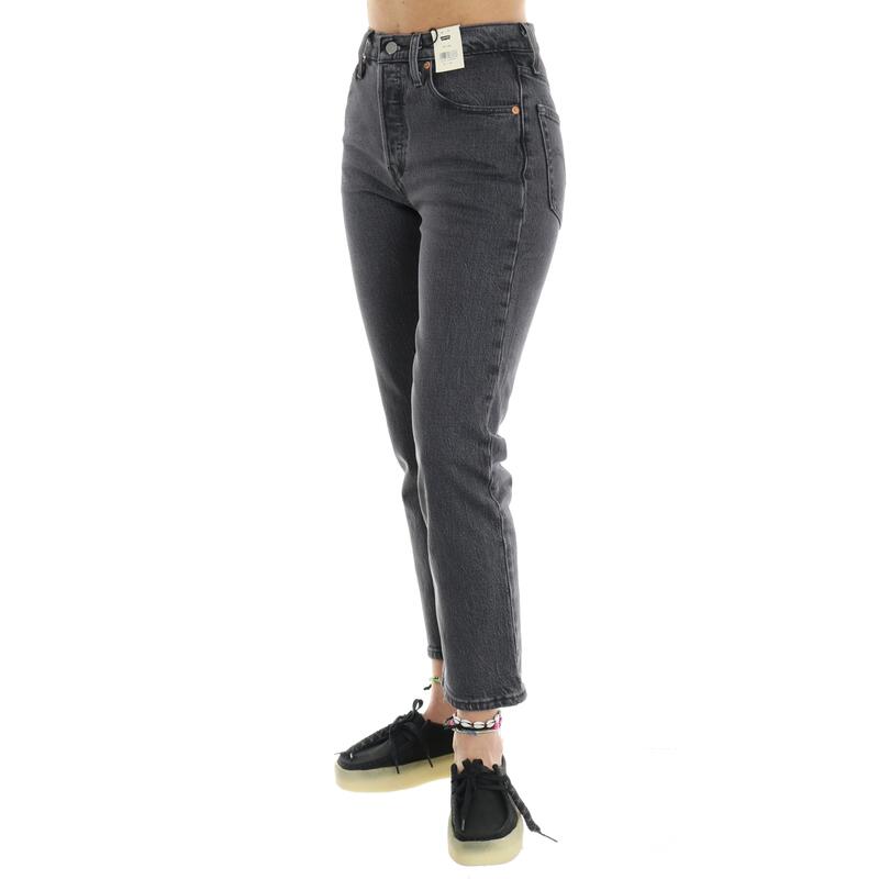 Jeans nero slavato stretch, vita alta, chiusura con bottoni, lunghezza alla caviglia. Vestibilità regular.