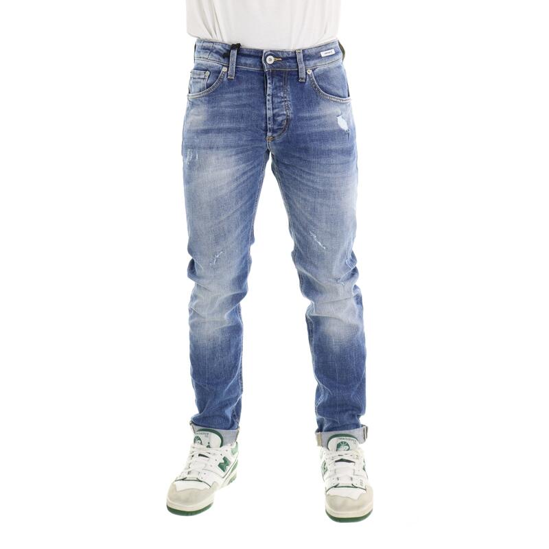 Jeans stretch slavato, vita media, salpa a contrasto, chiusura con bottone e zip. Vestibilità slim.