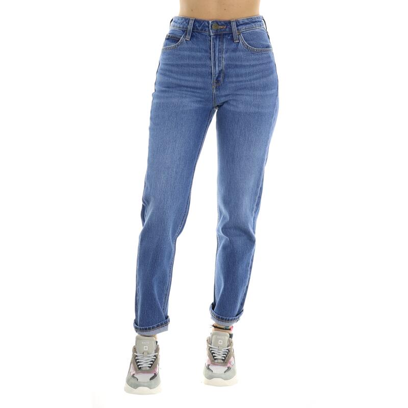 Jeans stretch lavaggio medio, vita alta, chiusura con bottone e zip, salpa a contrasto. Vestibilità regular.