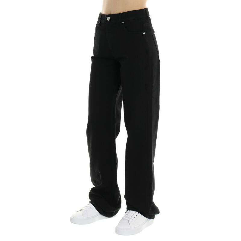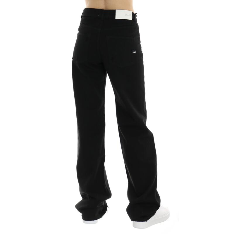 Bull denim in tinta unita, vita alta, chiusura con bottone e zip. Vestibilità regular.