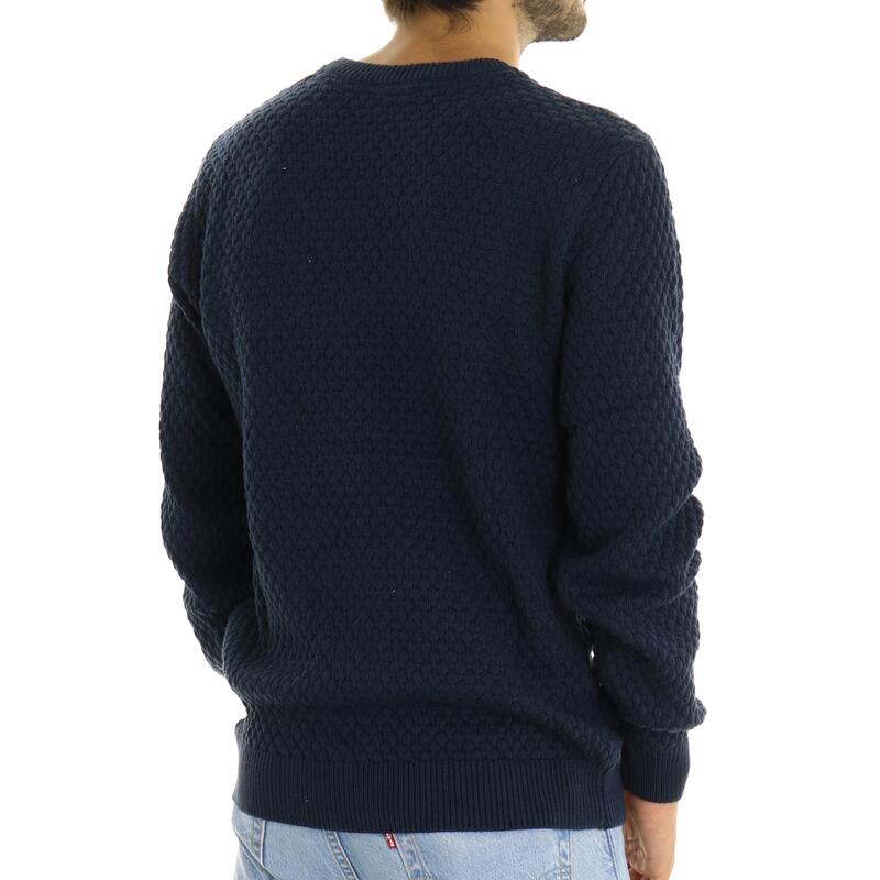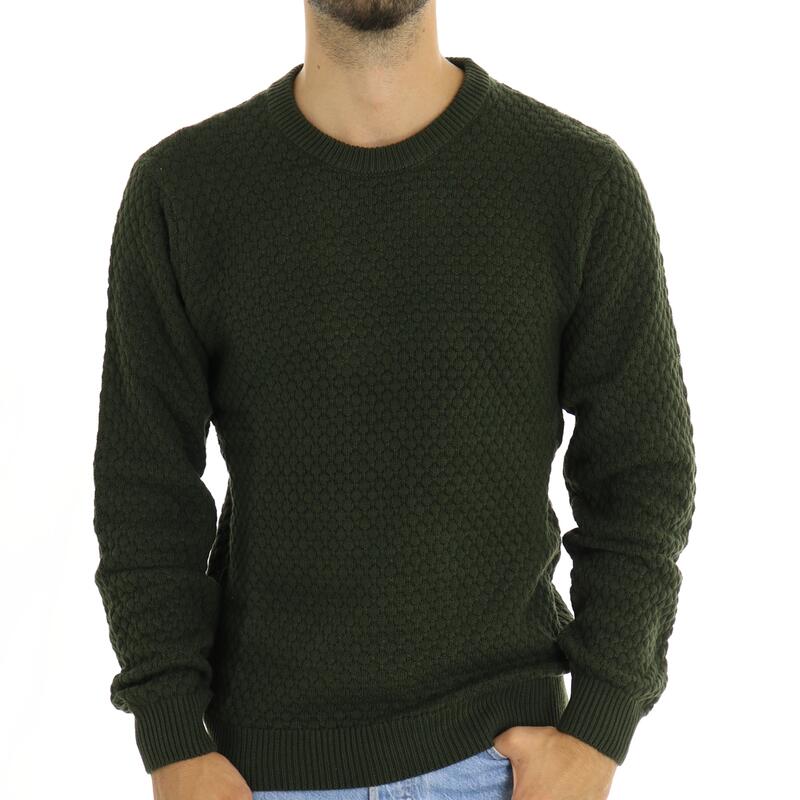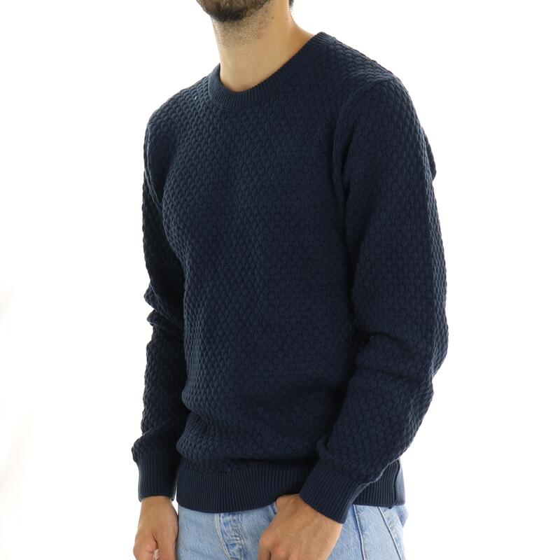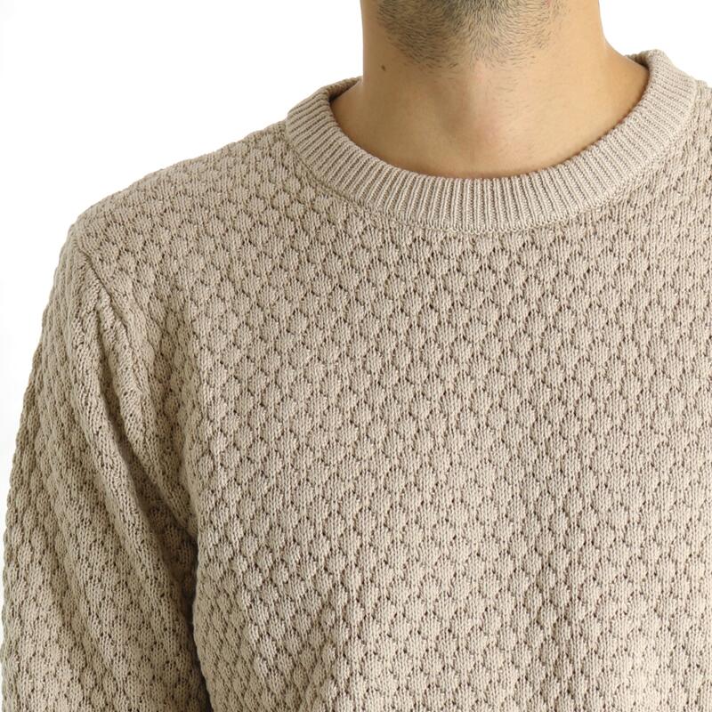 Maglia girocollo, tinta unita, lavorazione chicco riso in rilievo tono su tono. Vestibilità regular.