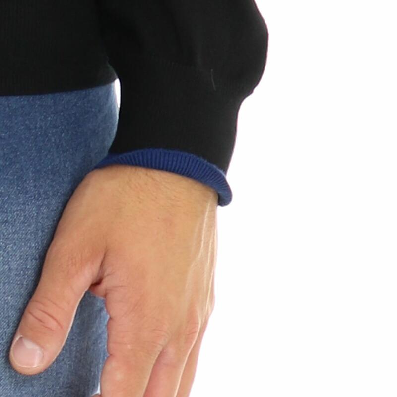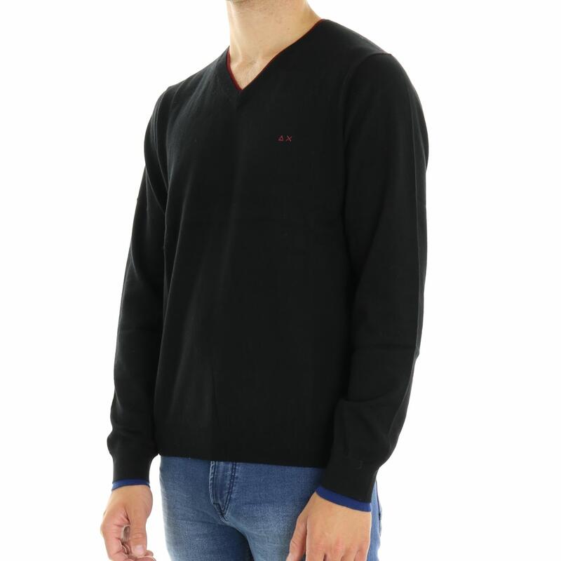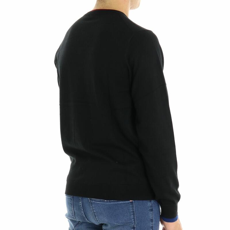 Maglia scollo a V, tinta unita, dettagli a contrasto sul collo e sui polsini, logo ricamato davanti. Vestibilità slim.