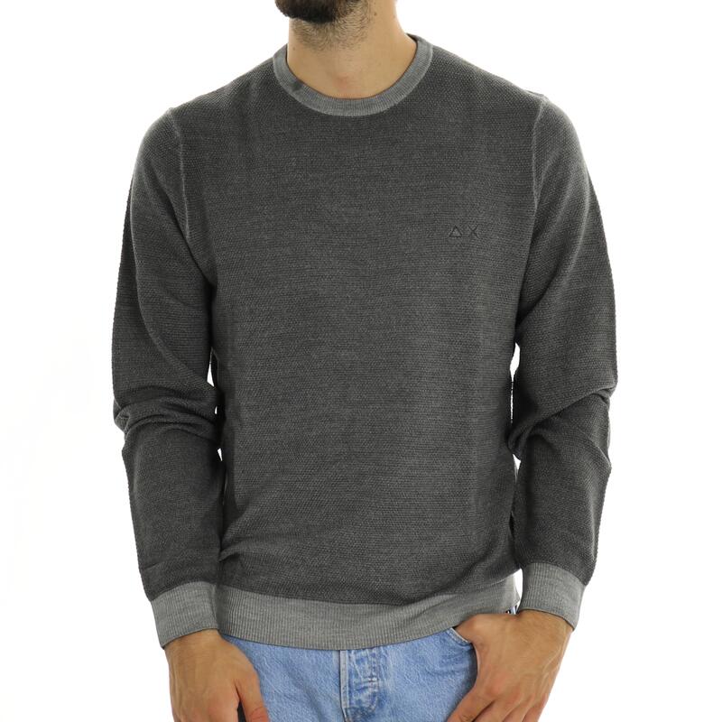 Maglia girocollo tintura a freddo, tramatura chicco riso, mini logo ricamato tono su tono. Vestibilità slim.