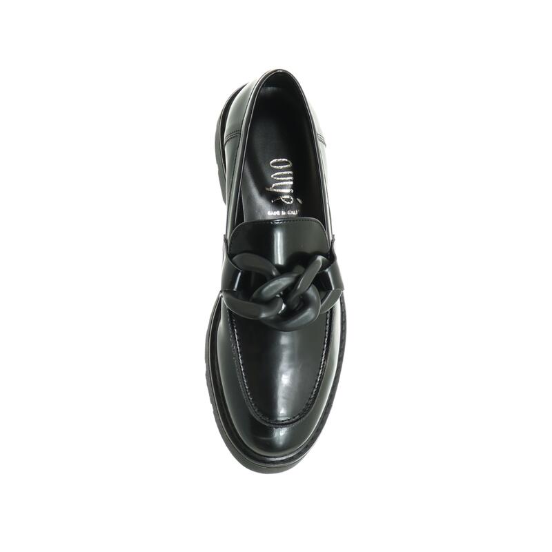 Mocassino in ecopelle nero effetto lucido, catena nero opaco, suola 3 cm. Calzata regolare.