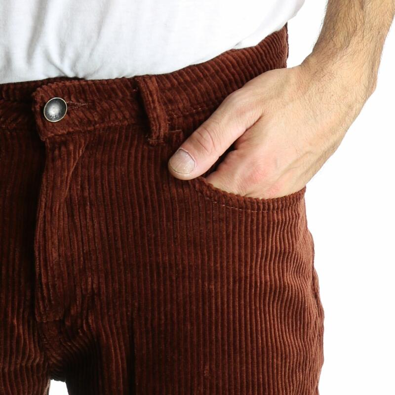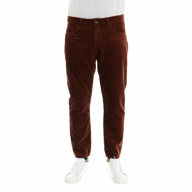 Pantalone cinque tasche, vita media, in velluto a coste rocciatore, chiusura con bottone e zip. Vestibilità regular.
