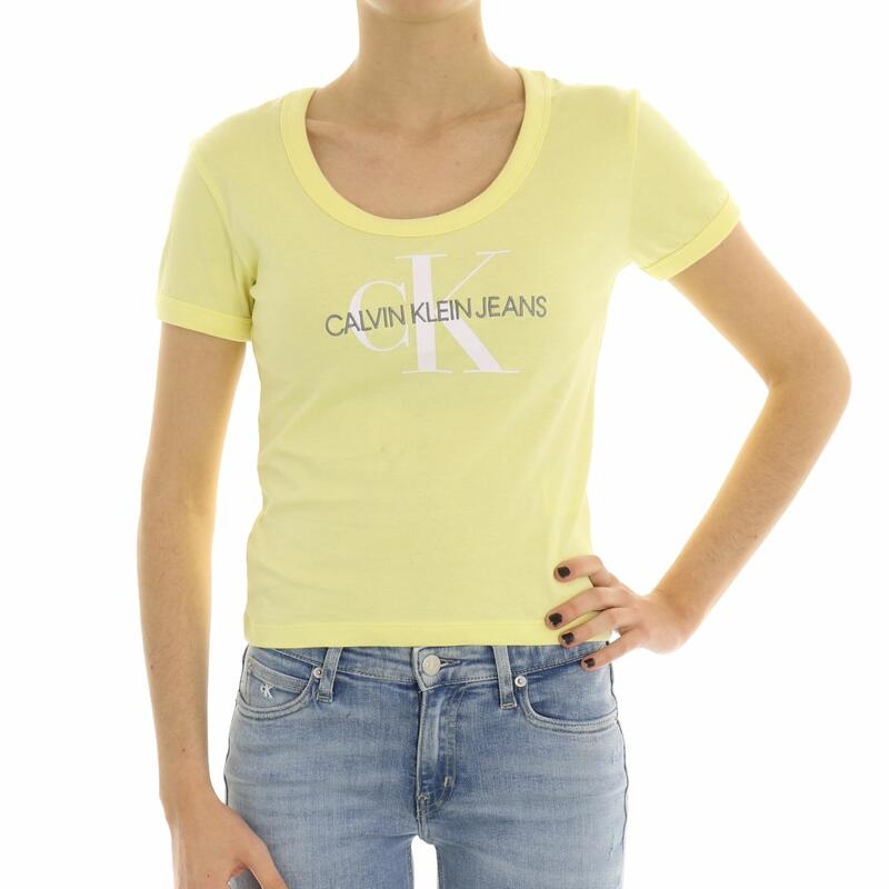 T-shirt mezza manica, girocollo, crop, logo frontale ricamato e stampato. Vestibilità slim.