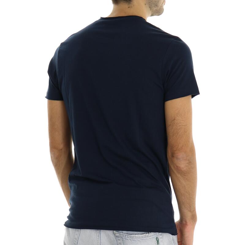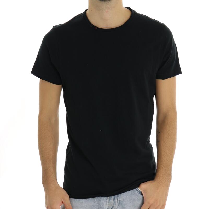 T-shirt mezza manica, girocollo, finiture taglio vivo, bottoncini sul collo. Vestibilità slim.
