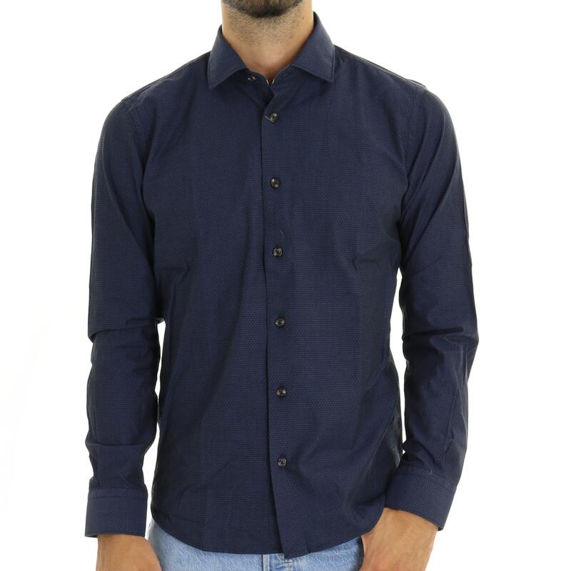 Camicia a maniche lunghe in microfantasia, collo inglese, pinces dietro. Vestibilità slim.
