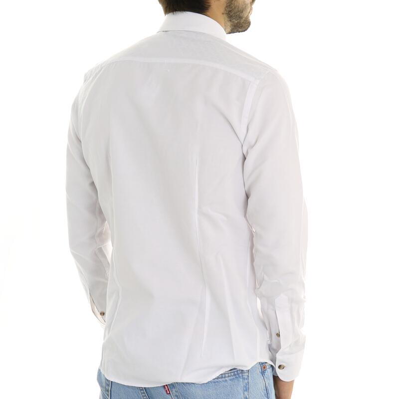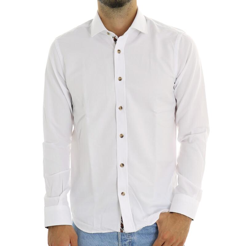 Camicia a maniche lunghe, collo inglese, tinta unita, sotto bottone e polsino fantasia, pinces dietro. Vestibilità slim.