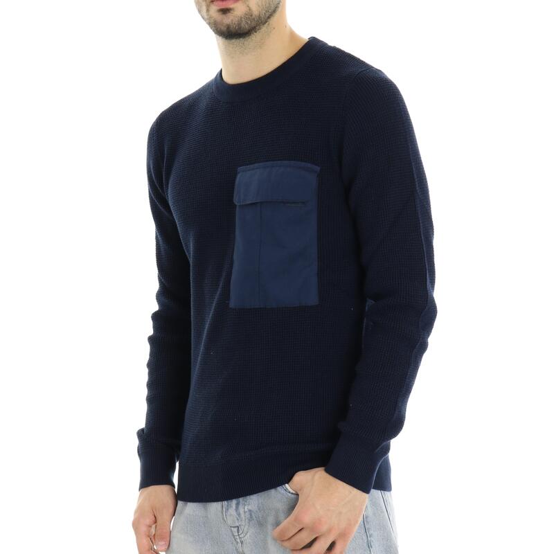 Maglia girocollo, tinta unita, materiale i rilievo a quadretti, tasca frontale patch. Vestibilità regular.