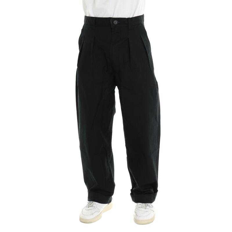 Pantalone in tinta unita, vita media con pinces, tasche america ai lati e posteriori con patta, chiusura con bottone e zip. Vestibilità over.
