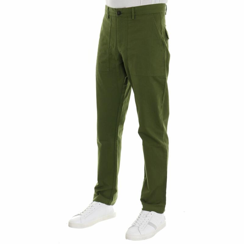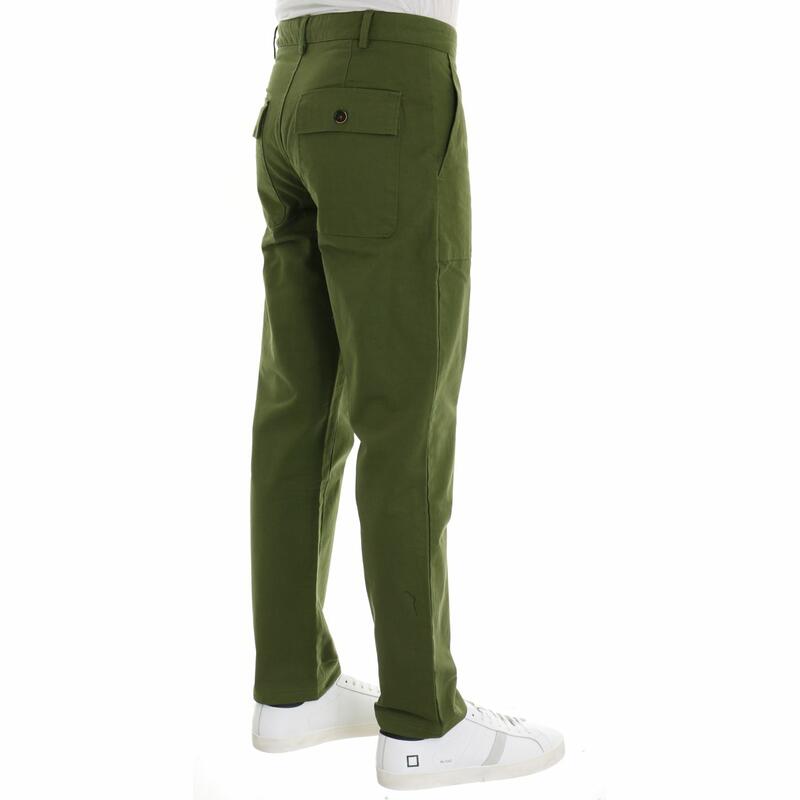 Pantalone tinta unita, vita media, tasche dietro con bottoni, chiusura con bottone e zip. Vestibilità regular.