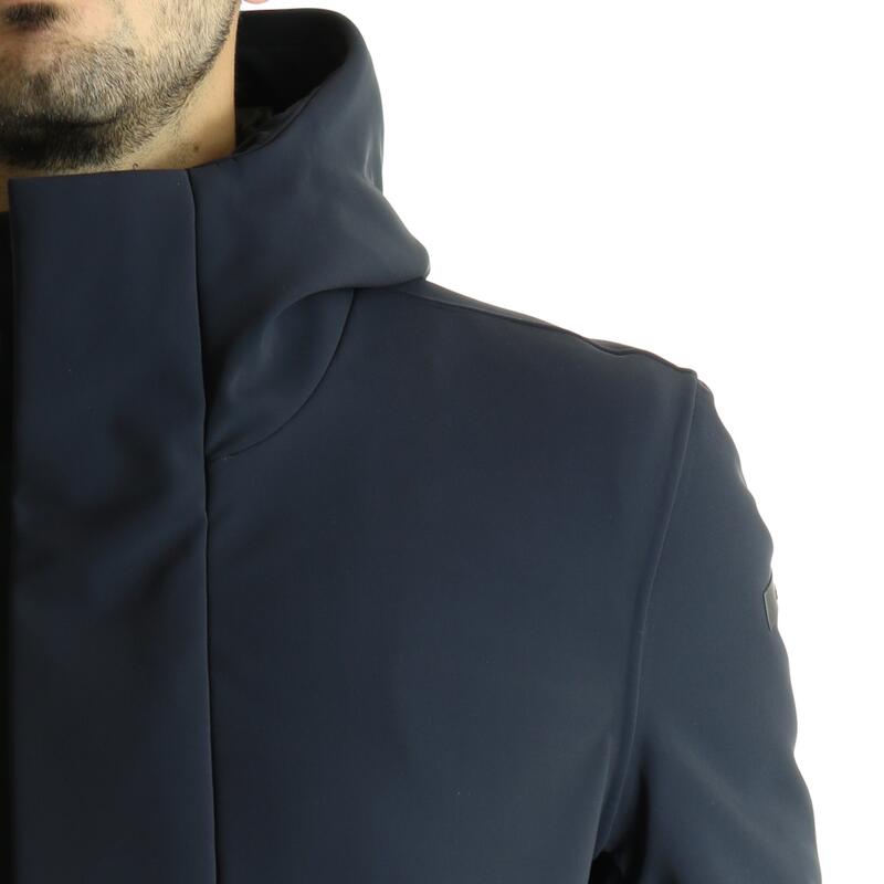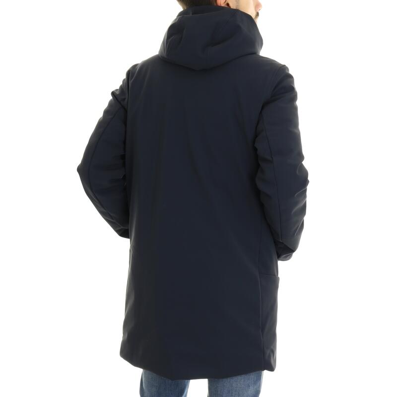 Piumino con cappuccio in tessuto tecnico stretch, impermeabile, traspirante, bottoni automatici e zip frontale coperta, tasche con zip. Vestibilità slim.
