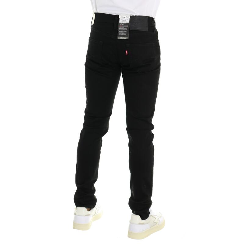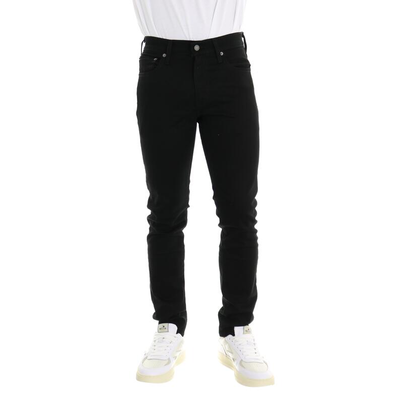Jeans stretch, nero, vita regular, salpa a contrasto, chiusura con bottone e zip. Vestibilità slim taper.