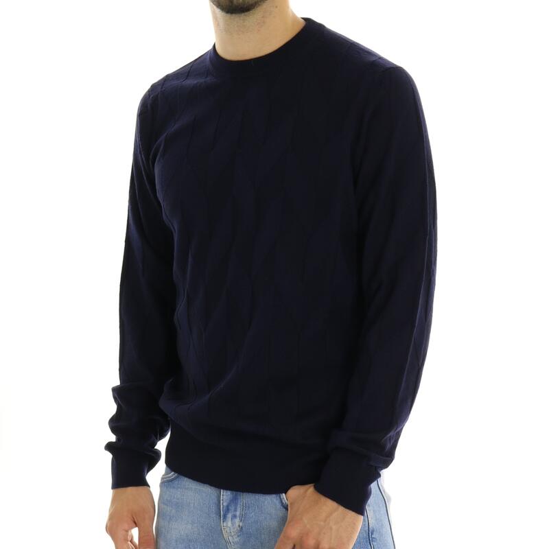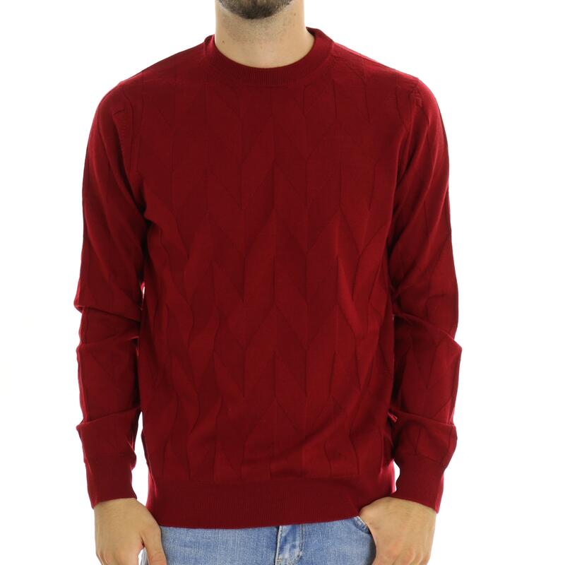 Maglia girocollo, in fantasia geometrica in rilievo tono su tono, polsini e balza in fondo. Vestibilità slim.