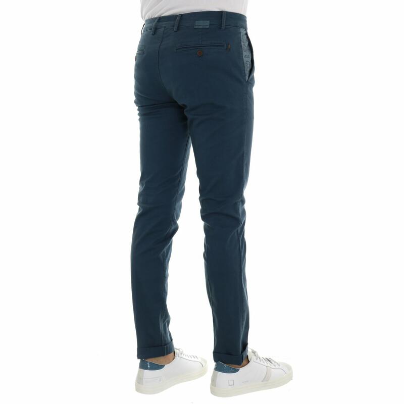 Pantalone tinta unita, vita regular, tasca america in fantasia a contrasto, chiusura con bottone e zip. Vestibilità slim.