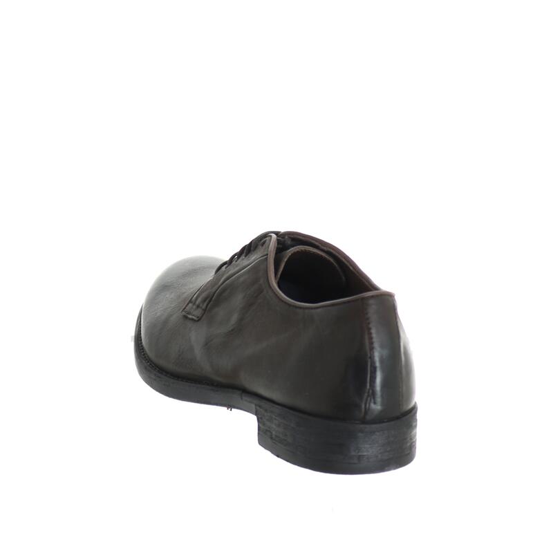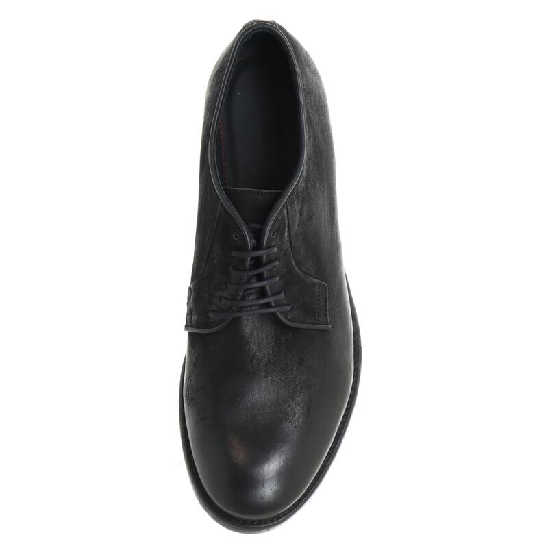 Scarpa stringata in pelle invecchiata con suola in cuoio cucita e antiscivolo in gomma, calzata abbondante.